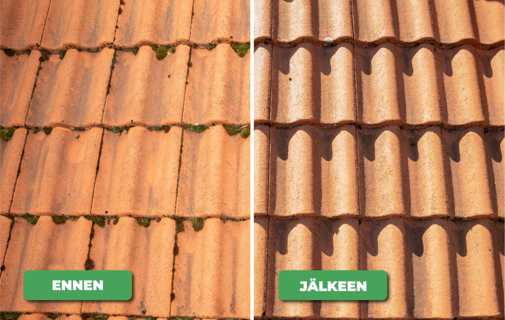 Käyttämämme aine on tehokasta kasvustonestoainetta, joka vaikuttaa levityksestä vielä 1-2 vuotta, tappaen ja poistaen sammaleen ja jäkälän. Suojaa uutta sammalta vastaan aineella saa yleensä 3-7 vuotta, jonka jälkeen sammal pääsee taas kasvamaan tiilellä.